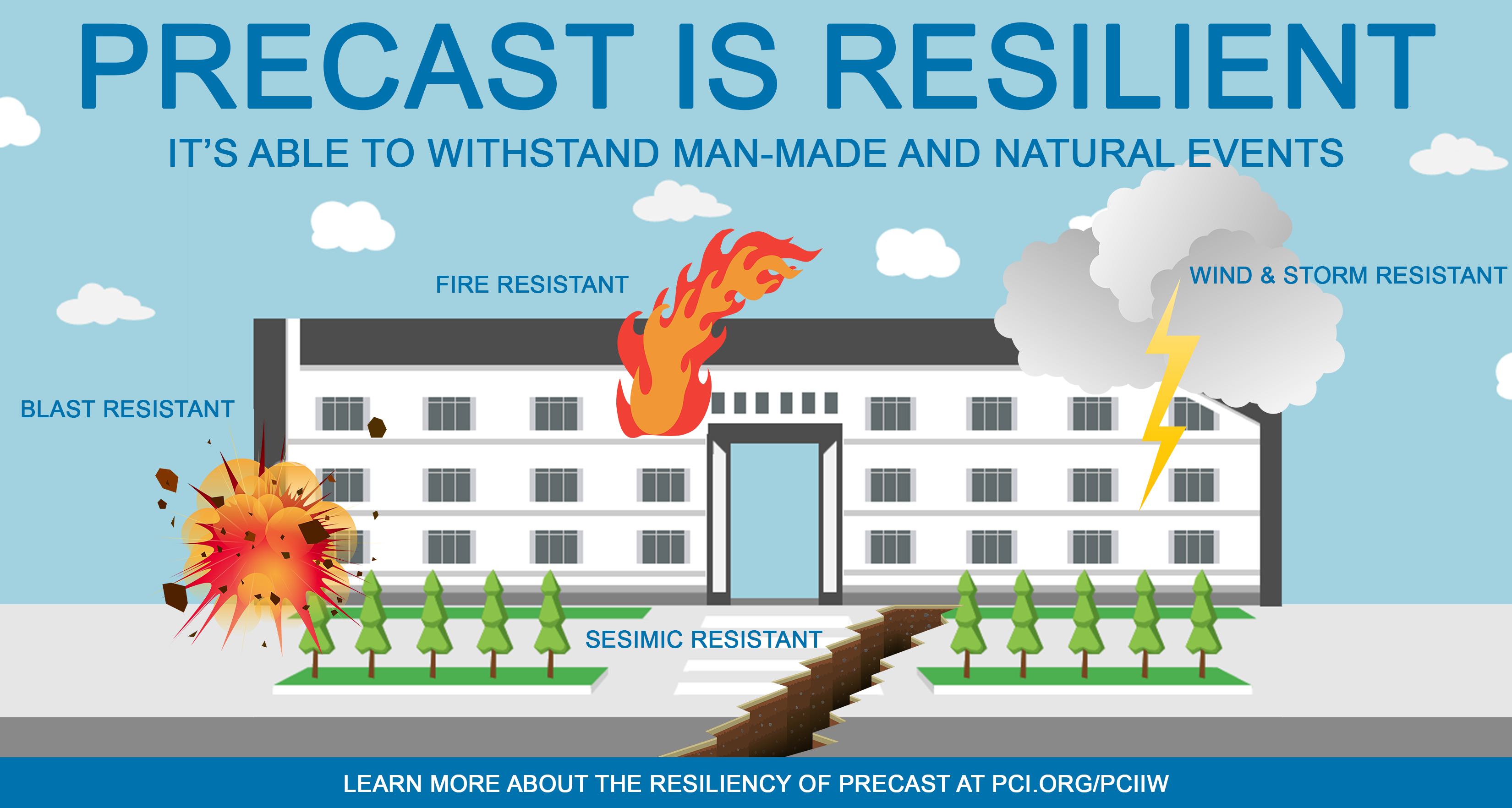 It is a difficult time for our infrastructure.  Wildfires, floods, severe storms, earthquakes and more have affected the structures within our communities. How can we protect them and the occupants inside?  The durability of precast concrete protects not only the people within a structure, but protects the day-to-day activities and life of the community around it.