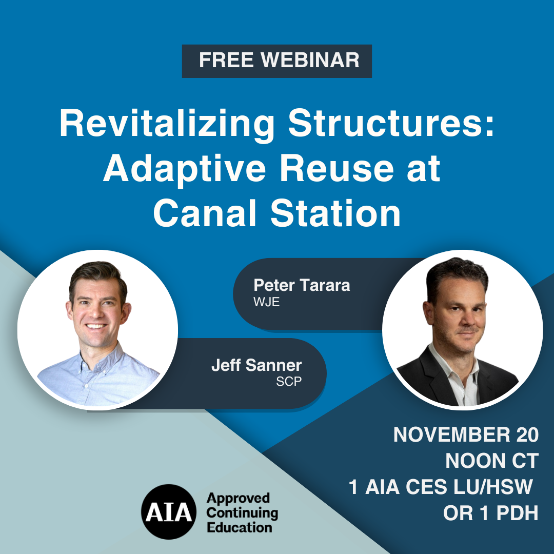 Date: Wednesday, November 20 Time: Noon CST Credits: 1 AIA CES LU/HSW or 1 PDH Cost: Free Presenters: Jeff Sanner (SCB) and Peter Tarara (WJE)